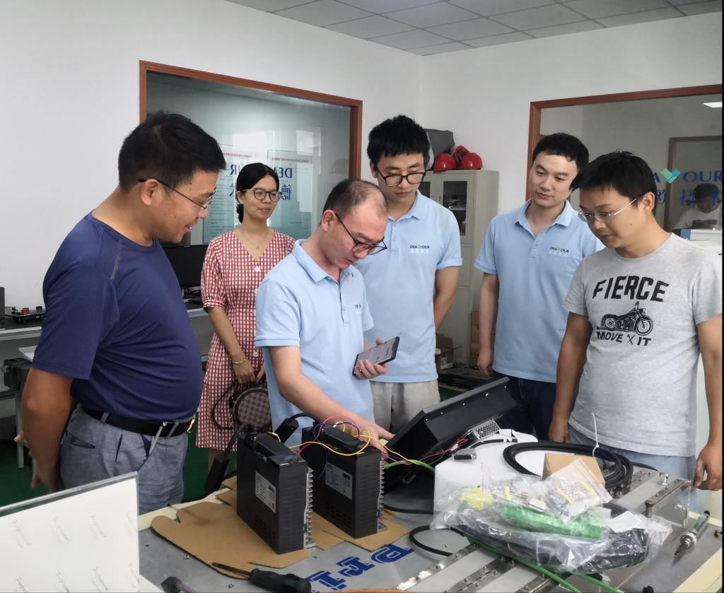 2021年7-8月,电气支部就前期企业提出的技术难题进行深入了解和研究,联合德欧电气支部组织双方技术骨干进行突击攻关,解决的难点集中在产品批量时技术指标一致性检测问题。由于伺服驱动器是高端智能装备如机器人或机床的核心部件,为保证整个装备运行时保持高精度和实时性,驱动器技术指标如频率响应、反馈响应、带负载正反转协调能力等要求很高,所以批量检测其群控同步性能难度比较大,电气支部张今朝、徐永锋和傅文珍三位老师深入了解产品检测流程,并对关键参数采集进行分析,设计了一种多通道同步采集系统,可以对批量化驱动器参数检测时减少比对误差,提高了检测能力和效率,节约了成本。
