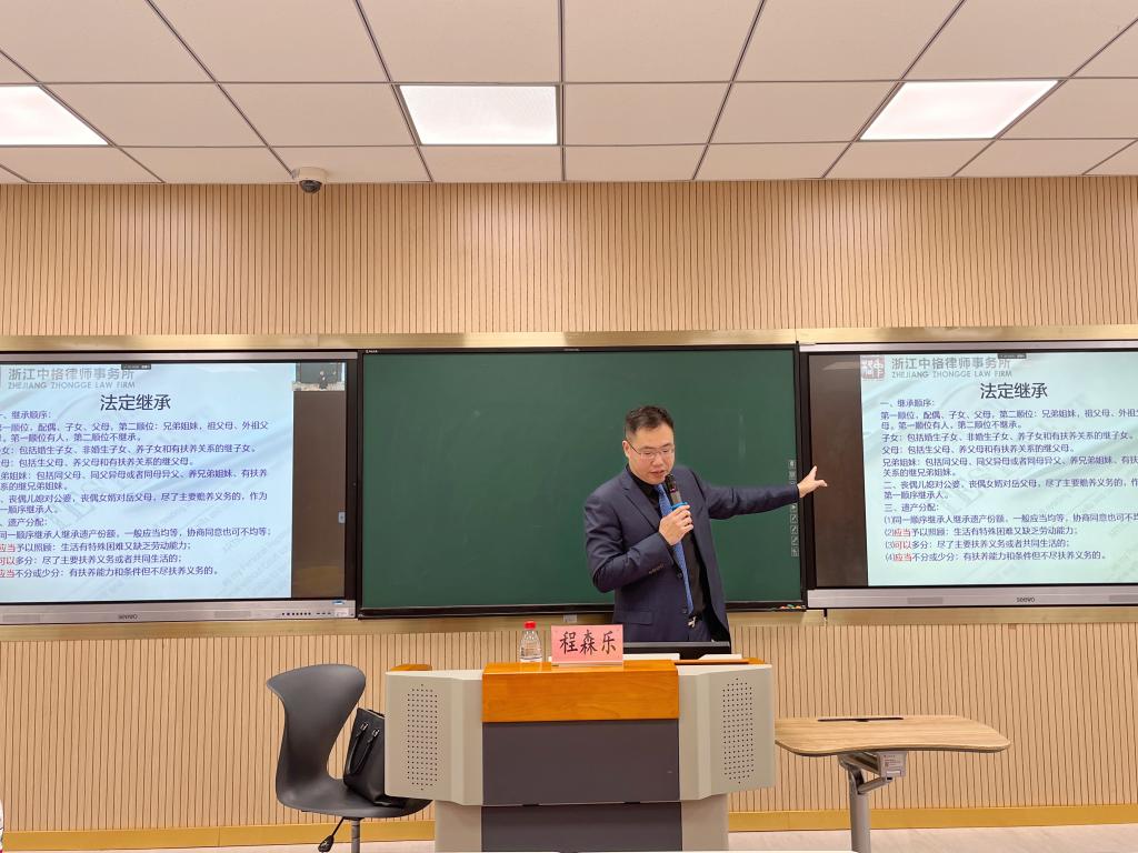 妇委会承办的“关爱职工,幸福同行”系列讲座之“爱与责任”法律讲座在兴礼楼209教室、钉钉直播群同步举行,邀请浙江中格律师事务所的程森乐律师主讲,线上线下共100余名师生参加讲座。