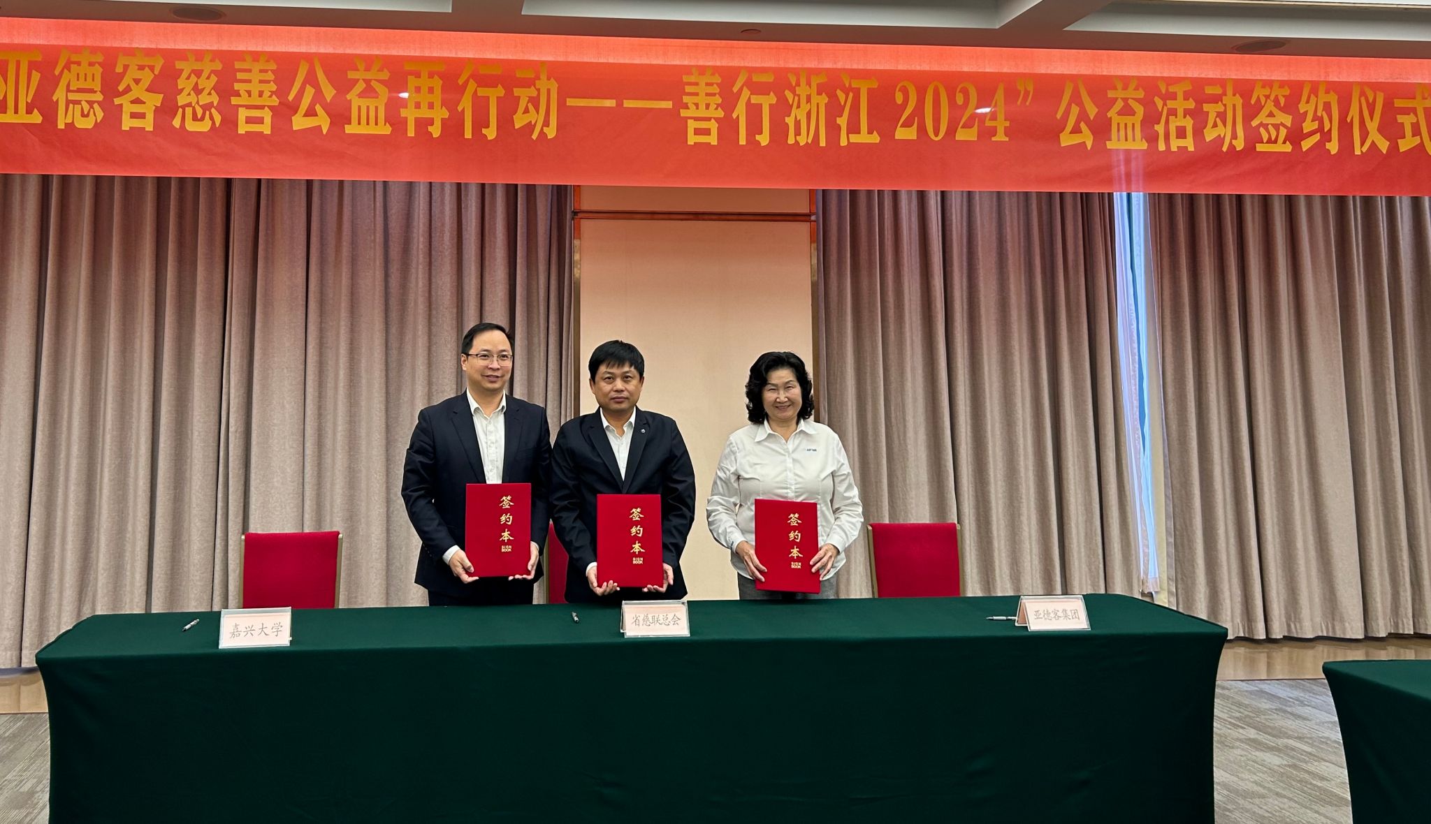 王立玮、楼喻刚和廖锦琳代表三方签署合作协议。亚德客国际集团董事长王世忠先生通过浙江省慈善联合总会向bet365